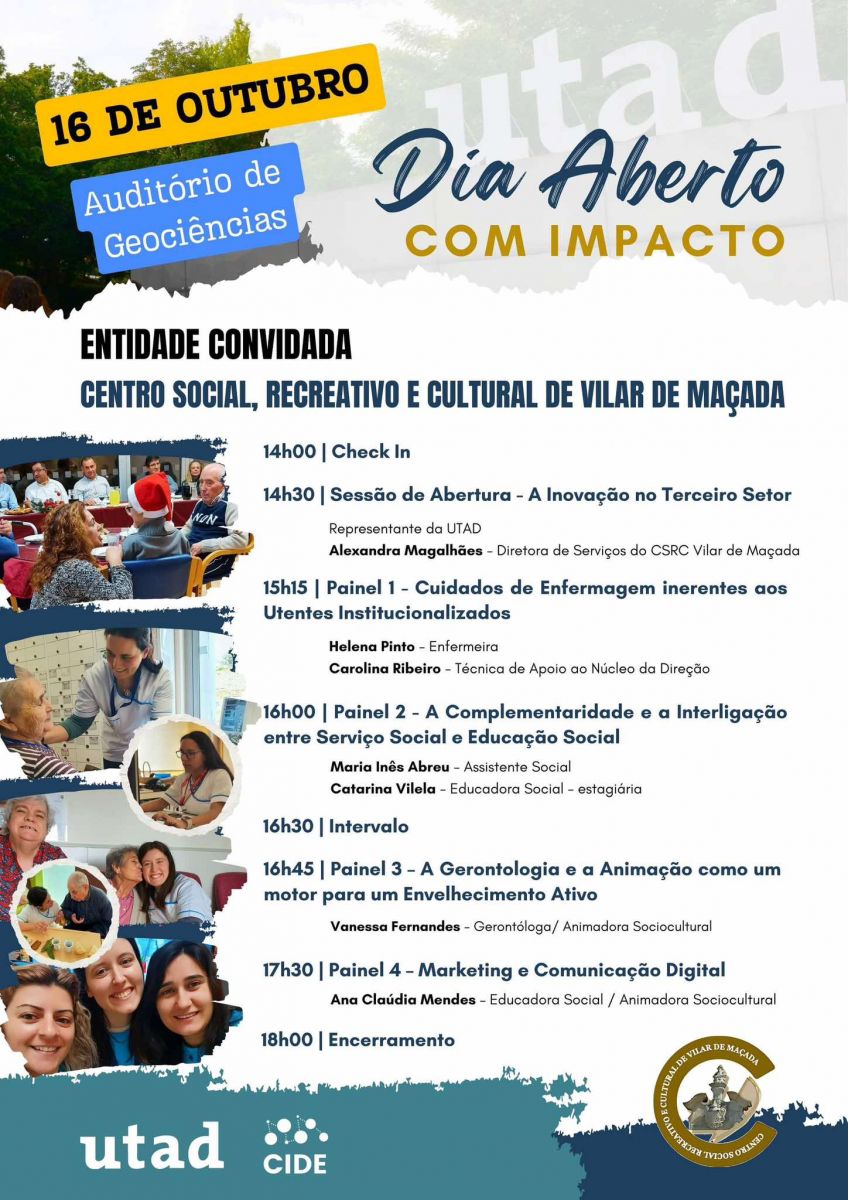 No dia 16 de Outubro, iremos marcar presença na UTAD no Dia Aberto onde iremos dar a conhecer a nossa Instituição, as nossas Respostas Sociais e os serviços que prestamos.